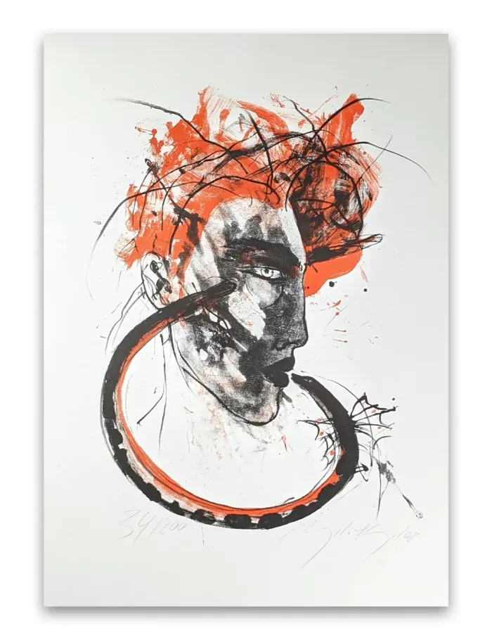 Schlange und Kopf von Angela Hampel (2008). Die hochwertige Druckgrafik ist mit Bleistift handsigniert, datiert und nummeriert. Das vorliegende Blatt ist 34 / 250. Das Blatt ist in einem Zustand der mit ‚gut‘ bezeichnet werden kann. Das Blattmaß ist ca. 42,1 x 59,2 cm.