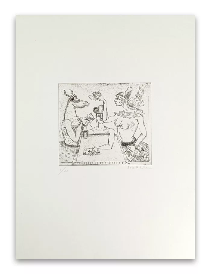 Kartenspiel von Bele Bachem. Die hochwertige Druckgrafik ist mit Bleistift handsigniert und nummeriert. Das vorliegende Blatt ist 4 / 20. Das Blatt ist in einem Zustand der mit ‚gut‘ bezeichnet werden kann. Das Blattmaß ist ca. 39 x 52,6 cm.
