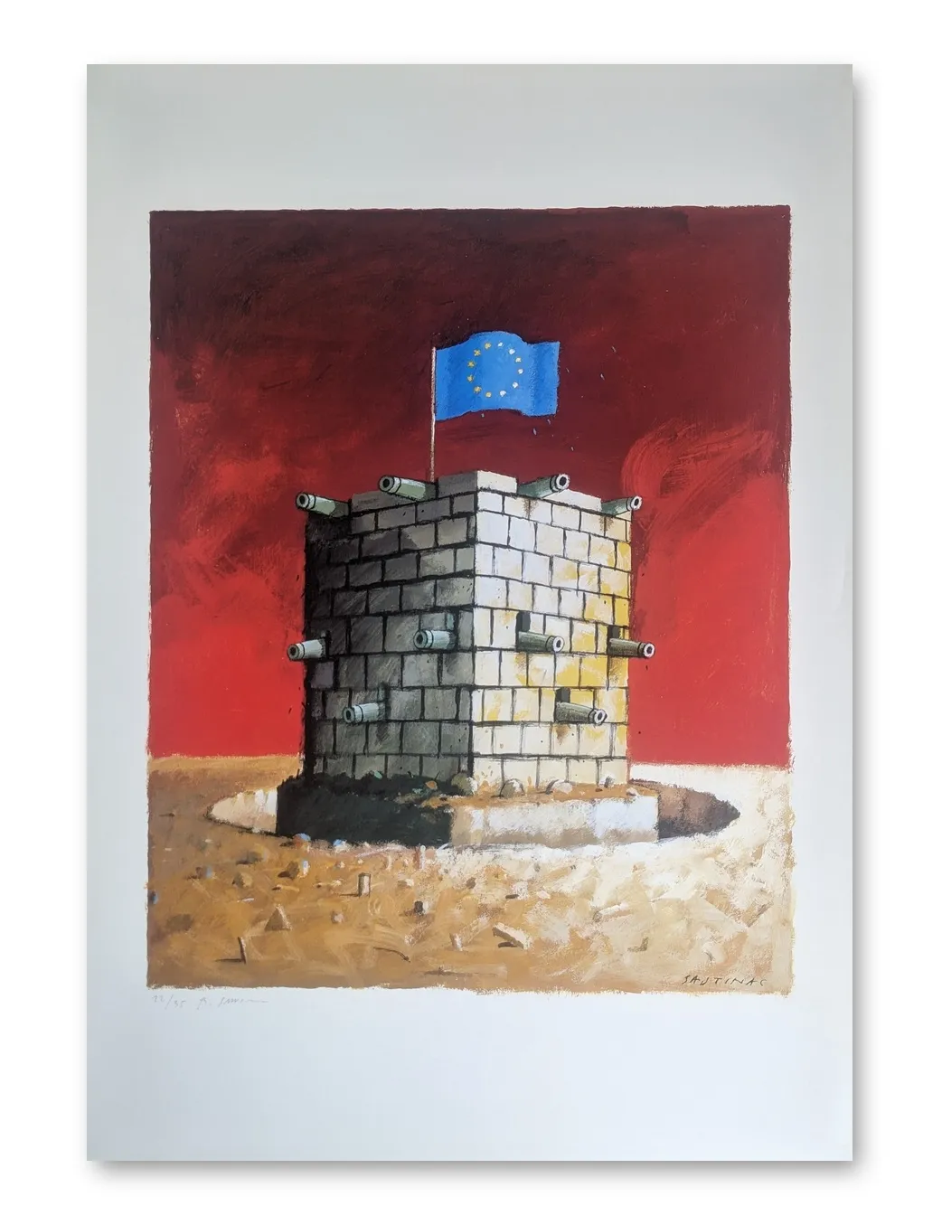 Festung Europa von Borislav Sajtinac (1994). Die hochwertige Druckgrafik ist mit Bleistift handsigniert und nummeriert. Das vorliegende Blatt ist 22 / 35. Das Blatt ist in einem Zustand der mit ‚gut‘ bezeichnet werden kann. Das Blattmaß ist ca. 59,5 x 84 cm.