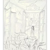 Trattoria von Erwin Shoultz-Carrnoff (1971). Die hochwertige Original-Zeichnung ist mit Bleistift handsigniert, datiert. Das vorliegend Blatt ist ein Unikat. Das Blattmaß ist ca. 30 x 39,7 cm, die Darstellung ca. 30 x 39,7 cm.