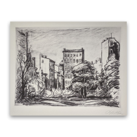 Hinterhof von Hans Bierbrauer (Oskar). Die hochwertige Original-Radierung ist mit Bleistift handsigniert. Das vorliegend Blatt ist ein Probedruck. Das Blattmaß ist ca. 50,8 x 63,5 cm, die Darstellung ca. 41,5 x 55,5 cm.