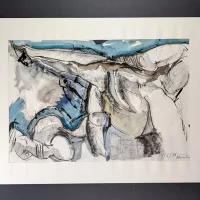 Abstrakte Landschaft von Jürg Häusler (1976). Die hochwertige Original-Aquarell ist mit Bleistift handsigniert und datiert. Das vorliegend Blatt ist ein Unikat. Das Blattmaß ist ca. 69.8 x 50 cm, die Darstellung ca. 54,7 x 36,8 cm.