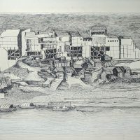 Flußdorf* vom Künstler Voigt (1960). Die hochwertige Original-Zeichnung ist mit Kugelschreiber handsigniert. Das vorliegend Blatt ist ein Unikat. Das Blattmaß ist ca. 84 x 63 cm, die Darstellung ca. 66 x 44 cm.