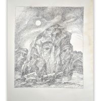 Der schwarze Berg von Walter Wellenstein (1960). Die hochwertige Original-Federzeichnung ist mit Bleistift handsigniert, datiert und betitelt. Das vorliegend Blatt ist ein Unikat. Das Blattmaß ist ca. 61 x 47 cm, die Darstellung ca. 43 x 36,5 cm.
